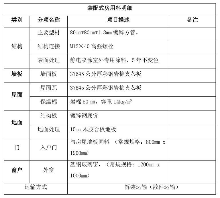 5.装配式房屋采用冷弯薄壁轻钢结构体系,墙面覆以彩钢复合夹芯板。
